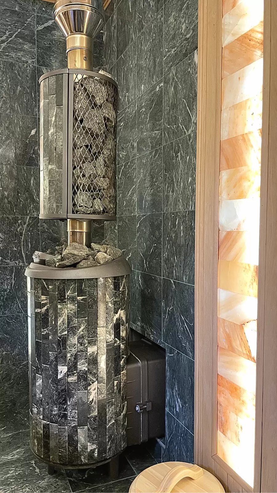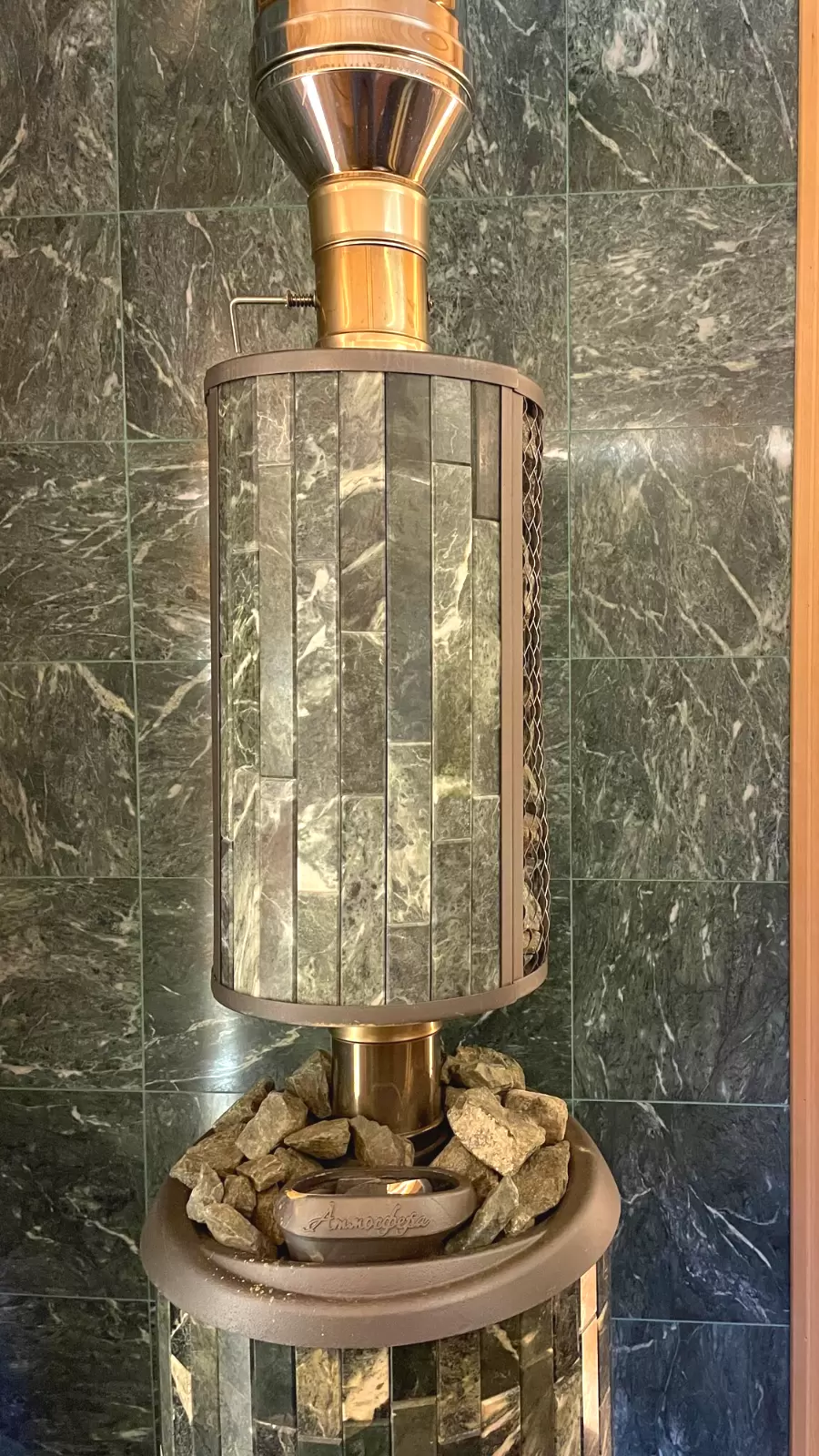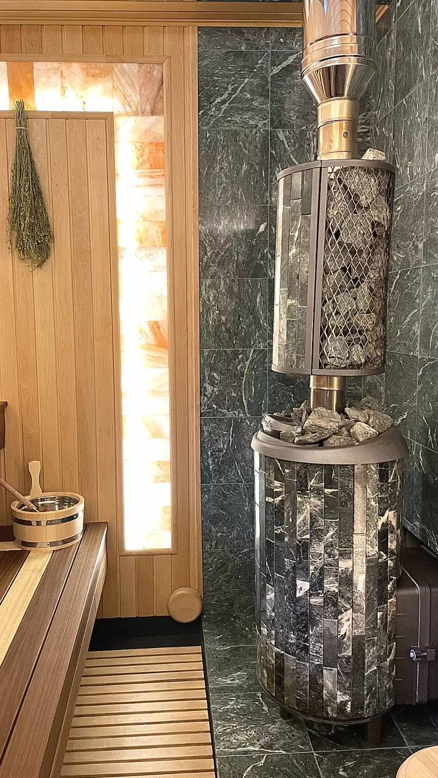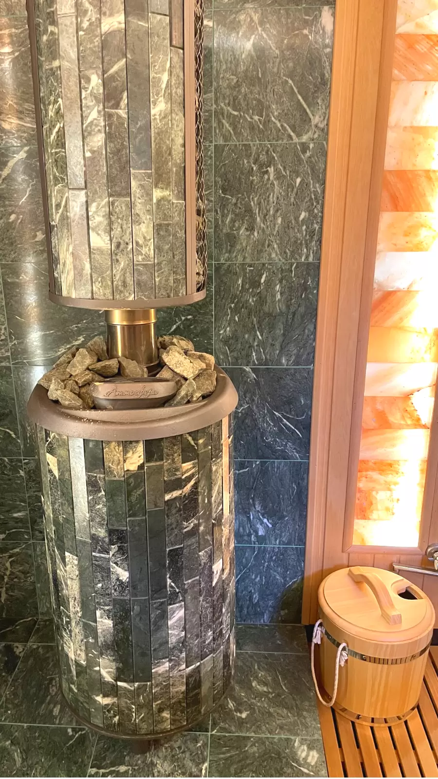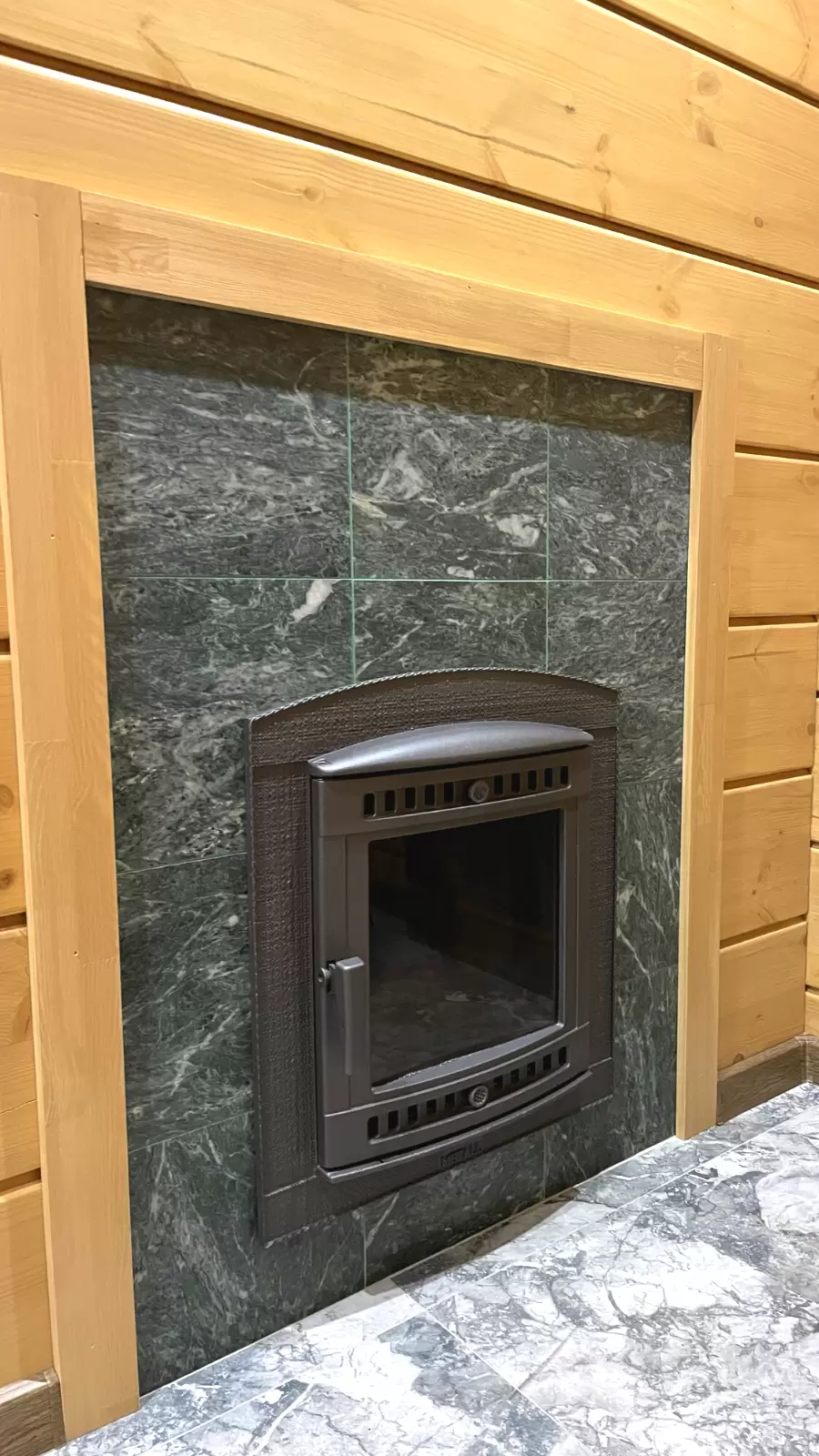 - сделана облицовка стен за печью плиткой из натурального змеевика;
