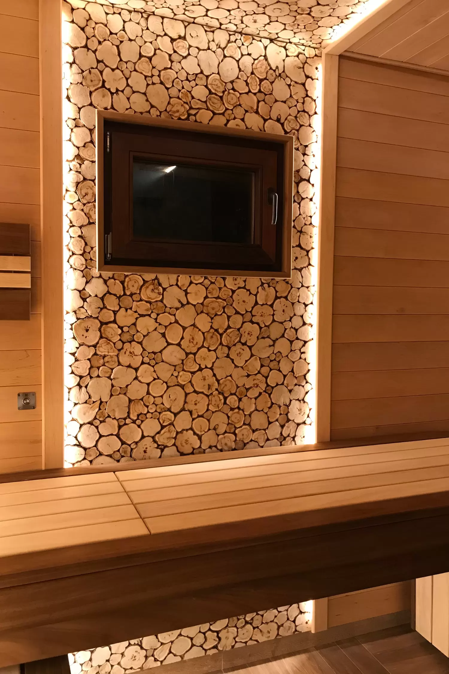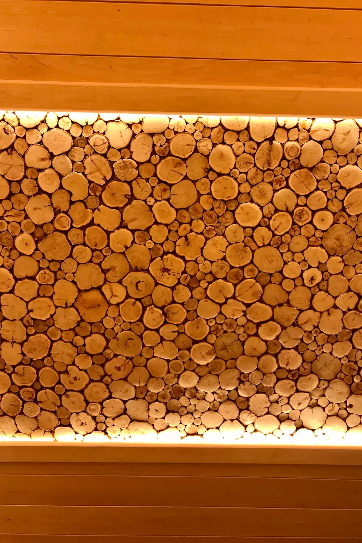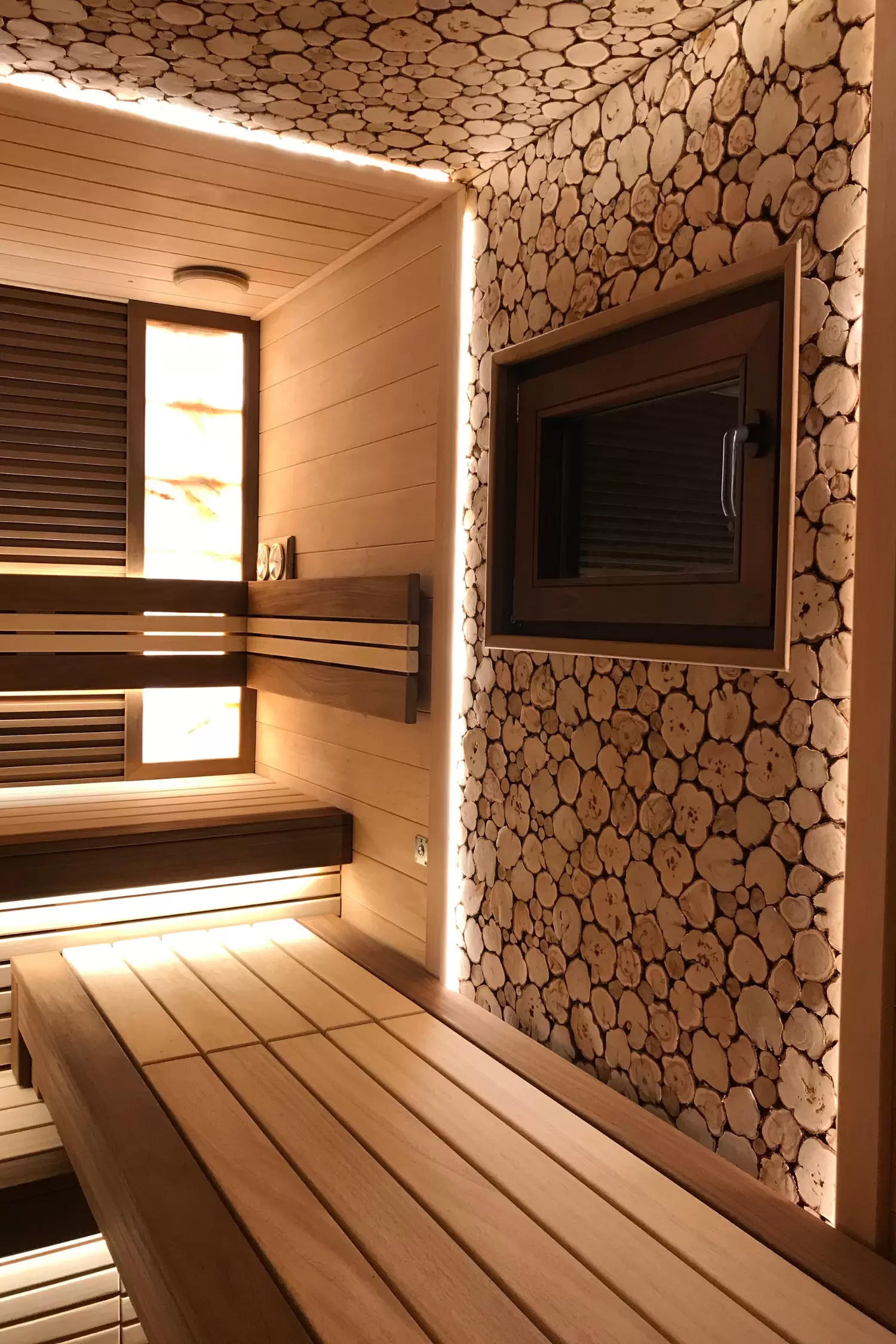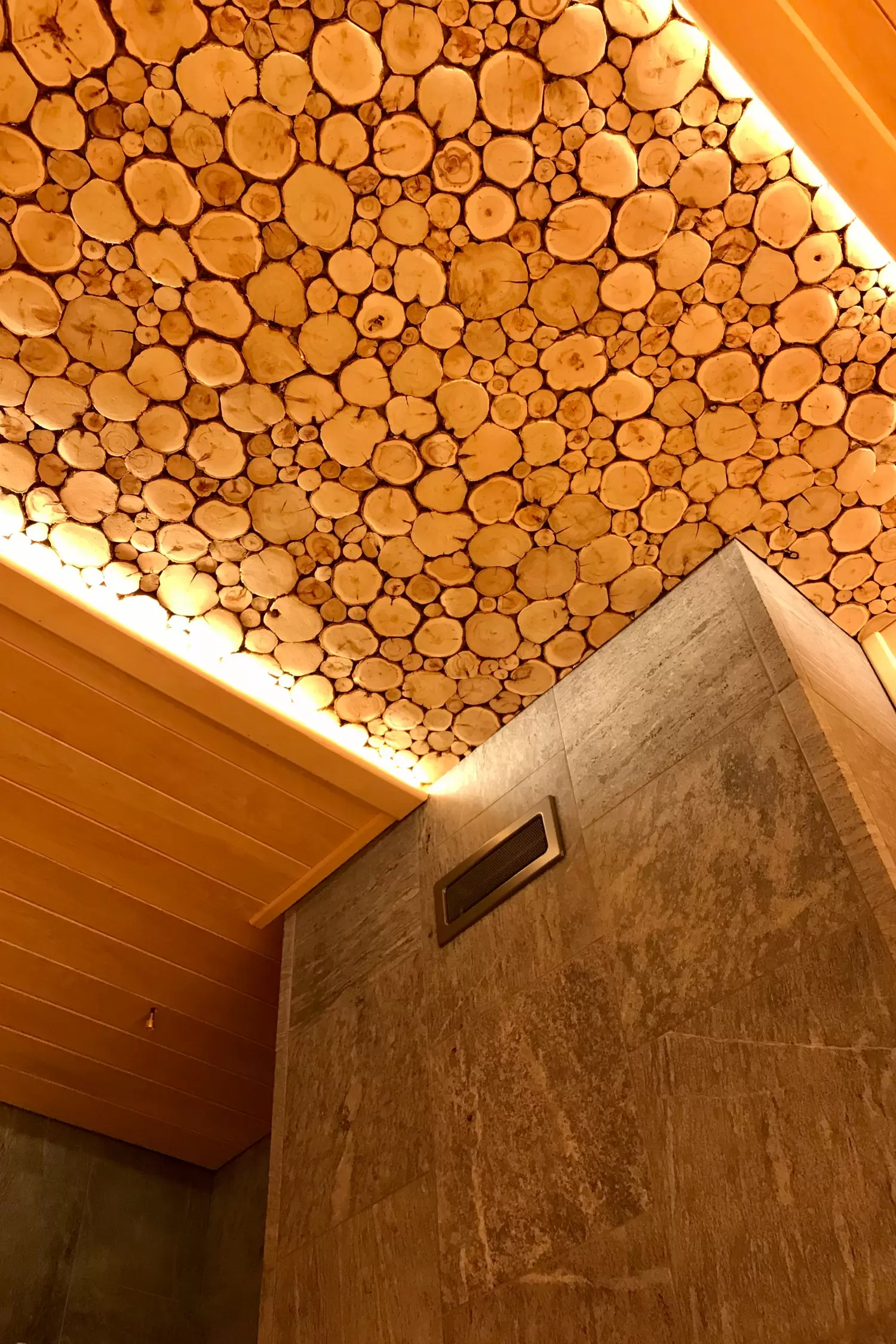 Очень интересный в исполнении и длительный проект. Сочетает в себе такие функциональные и эстетические решения как мобильный полок для парения с притоком воздуха, светильники из гималайской соли, панно из можжевельника, светодиодную подсветку полоков, декоративную стену из реечного абаша. Работы по данной парной велись на протяжении практически трех месяцев, что позволило довести данный проект до идеального состояния.
