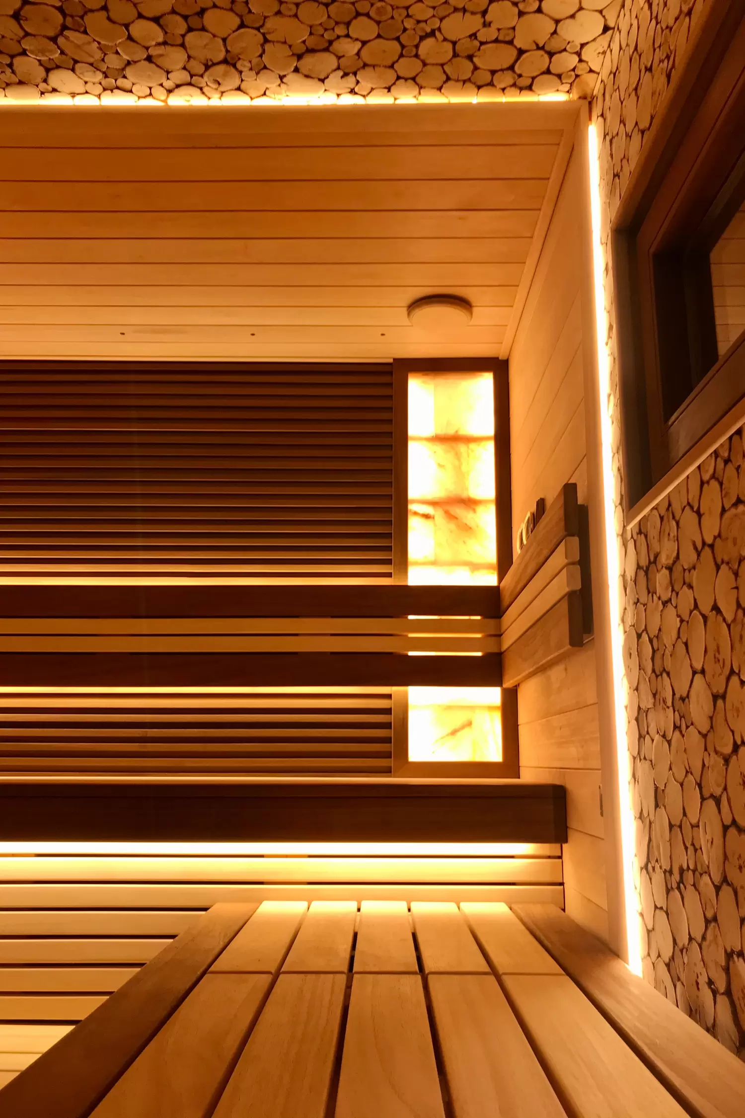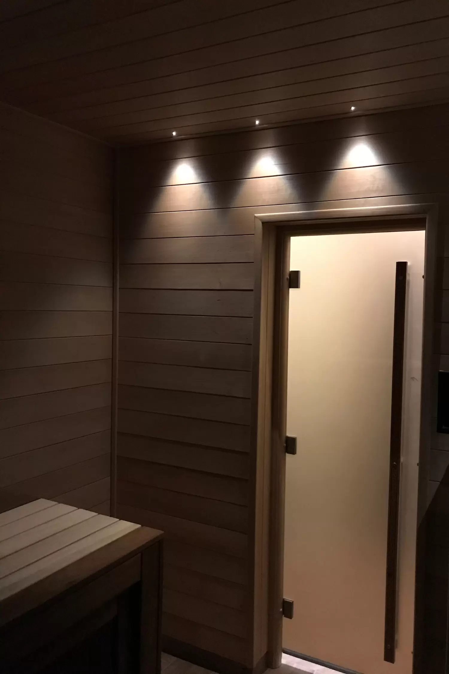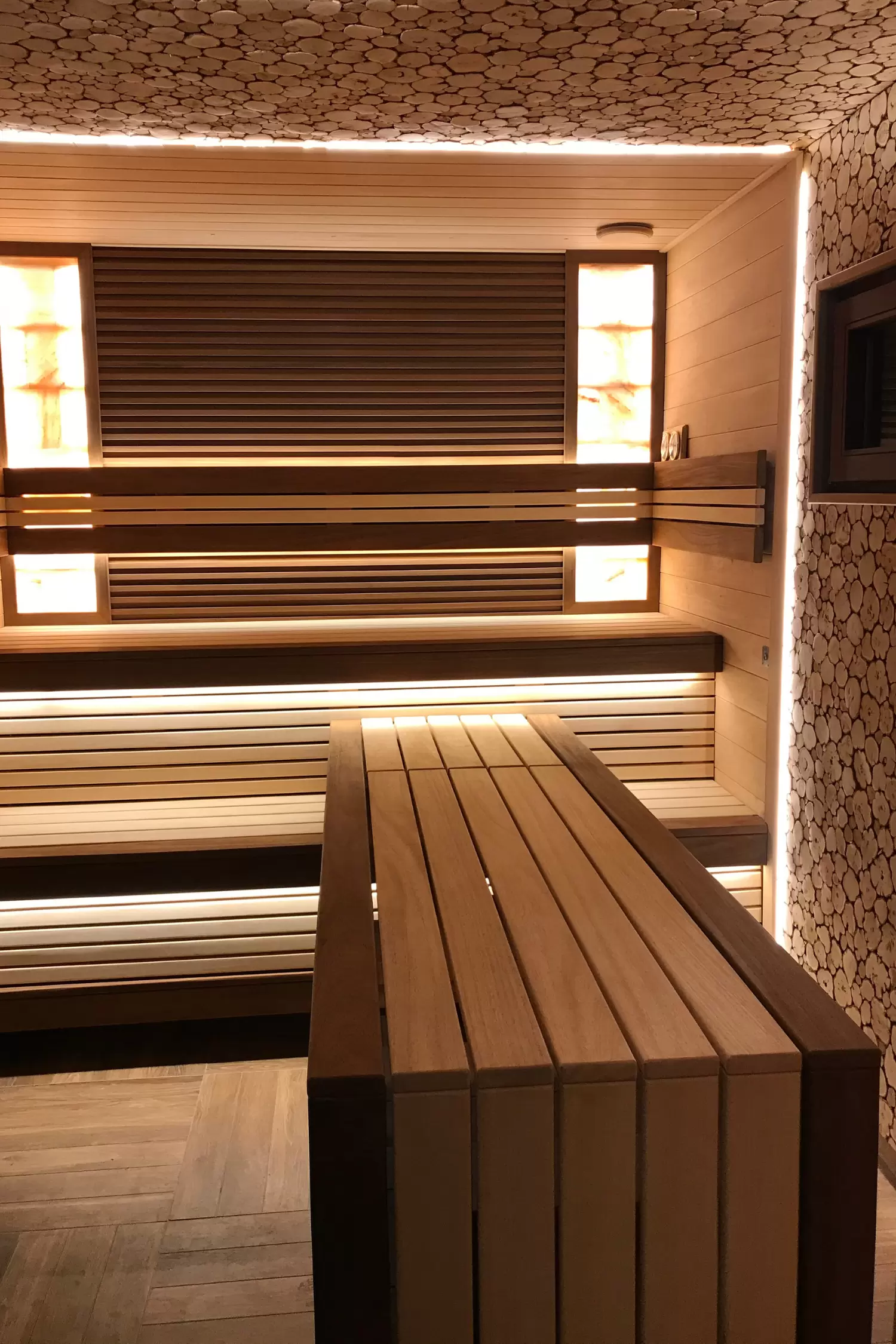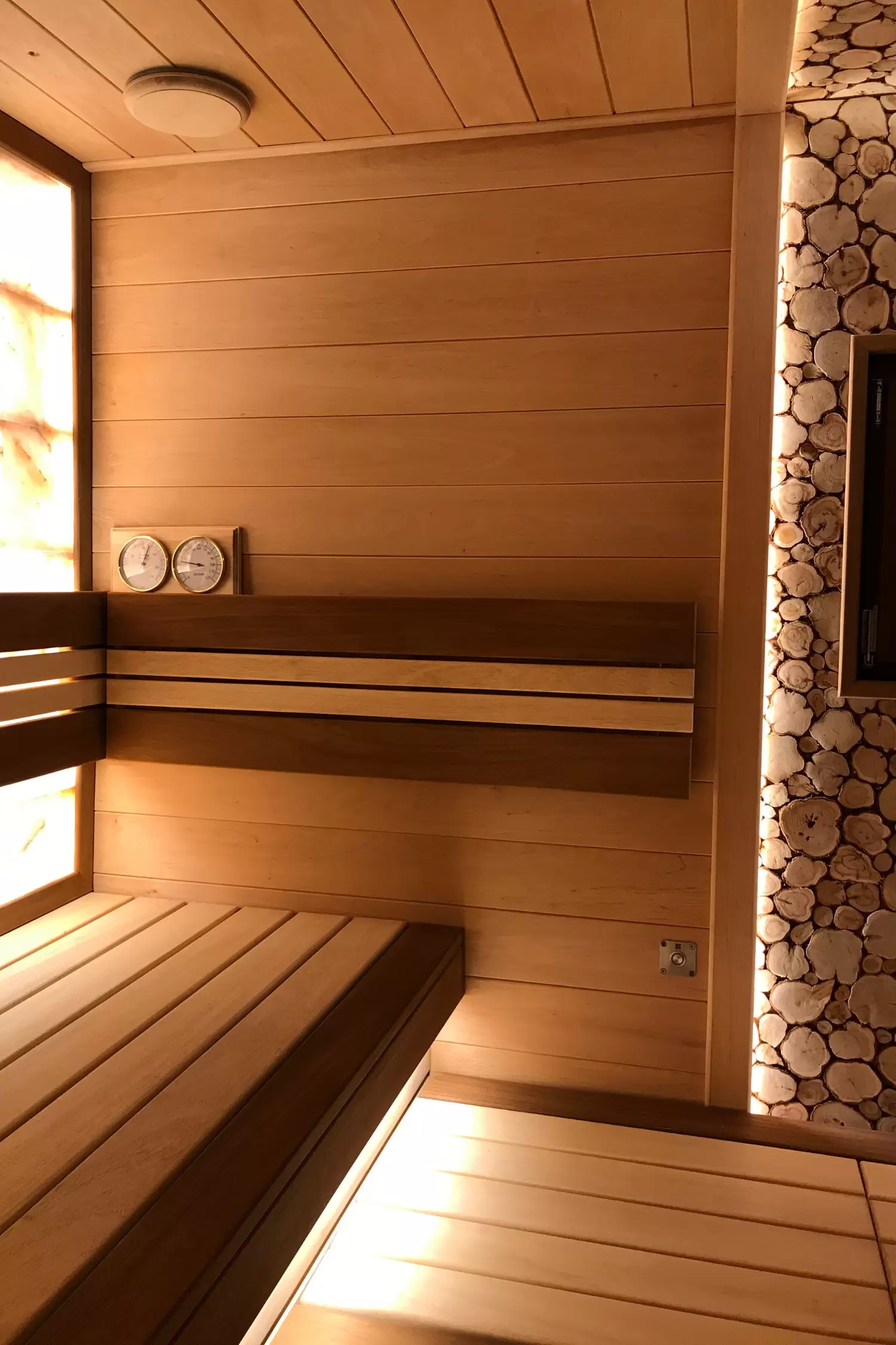 Очень интересный в исполнении и длительный проект. Сочетает в себе такие функциональные и эстетические решения как мобильный полок для парения с притоком воздуха, светильники из гималайской соли, панно из можжевельника, светодиодную подсветку полоков, декоративную стену из реечного абаша. Работы по данной парной велись на протяжении практически трех месяцев, что позволило довести данный проект до идеального состояния.