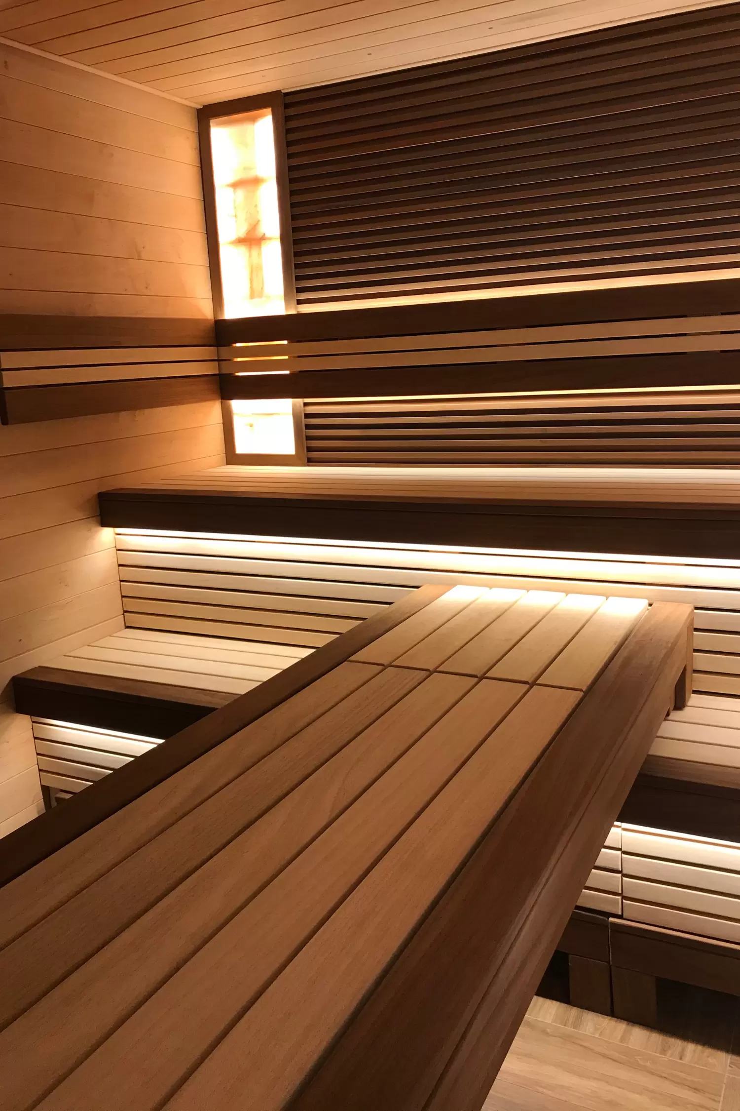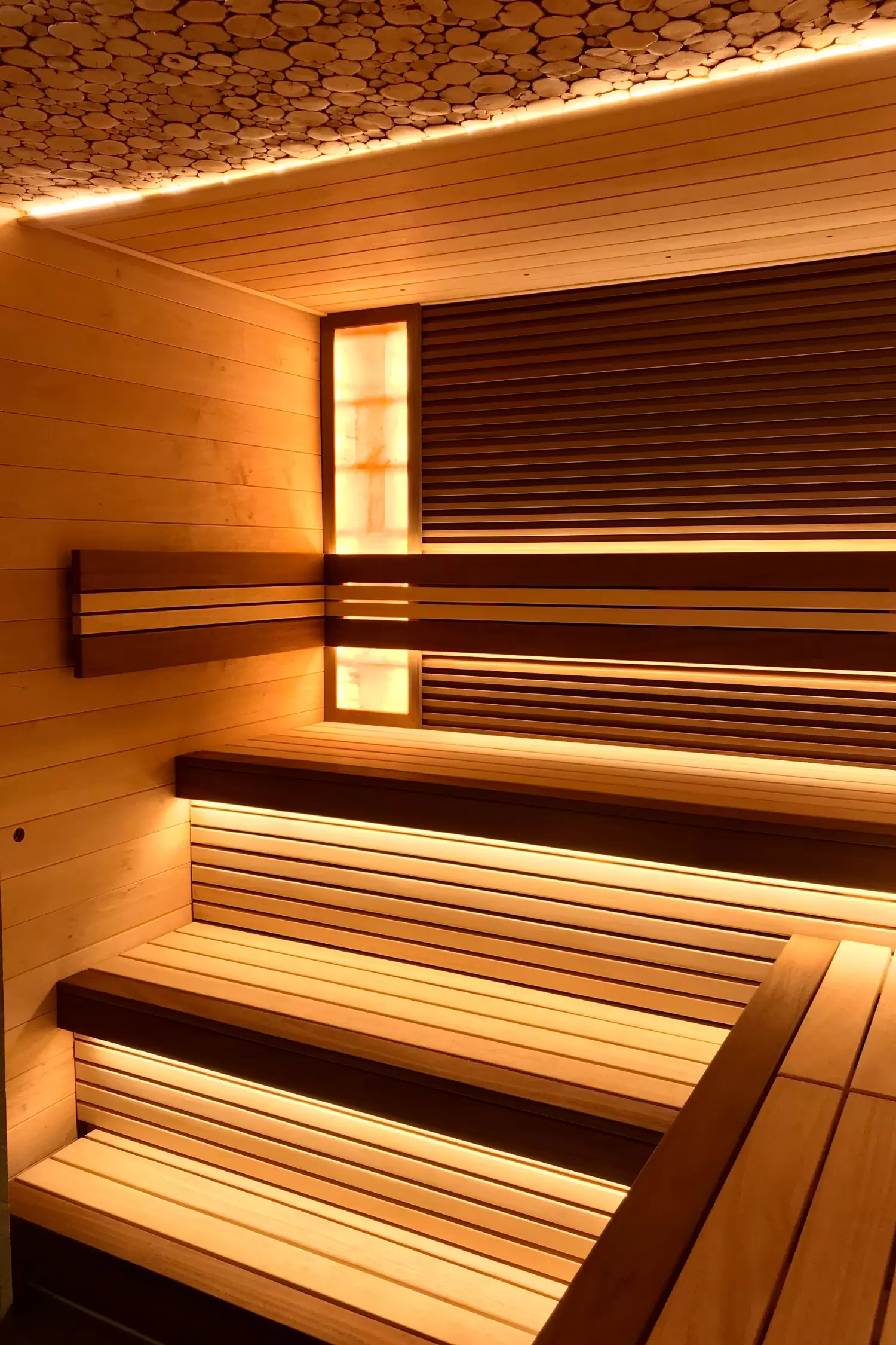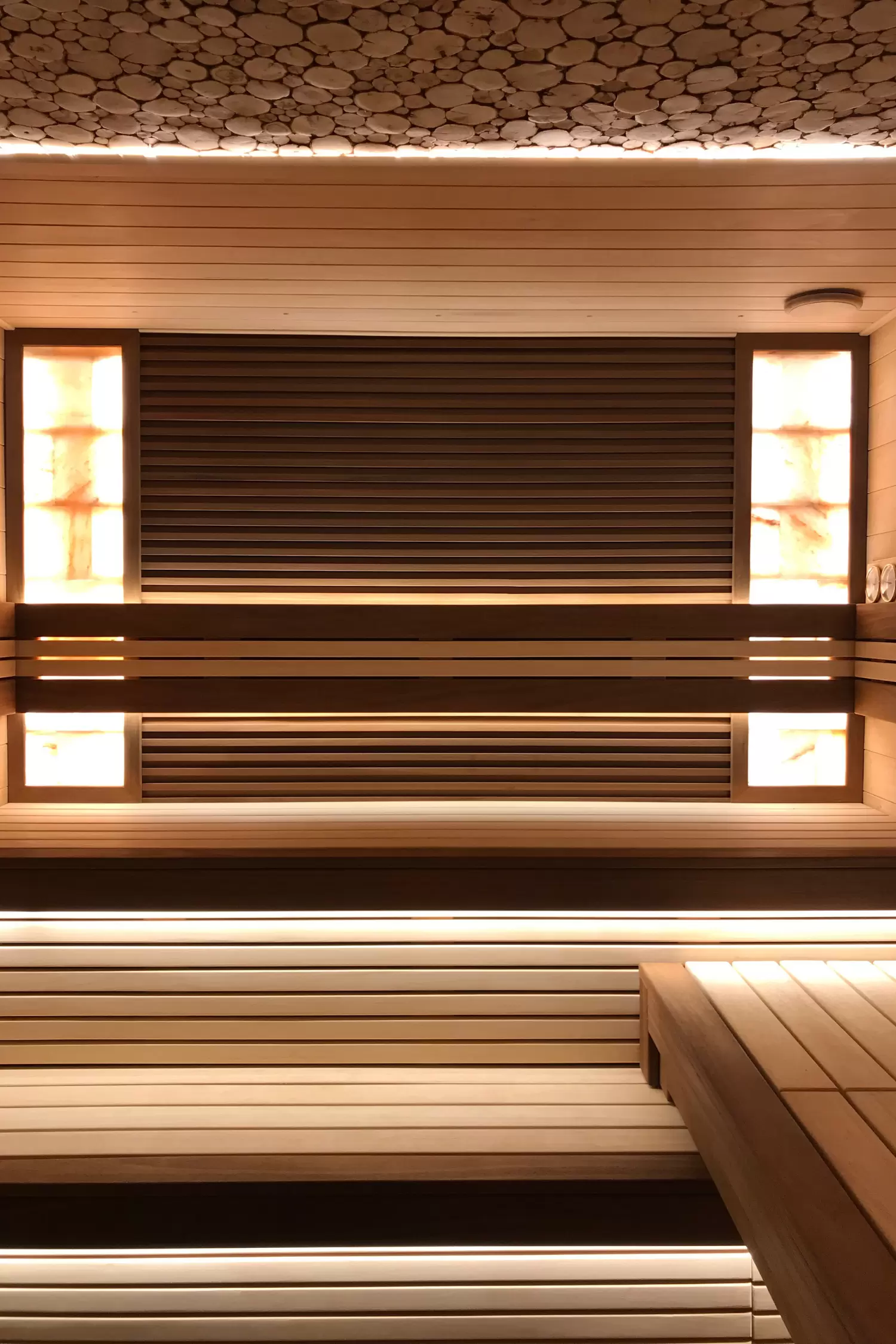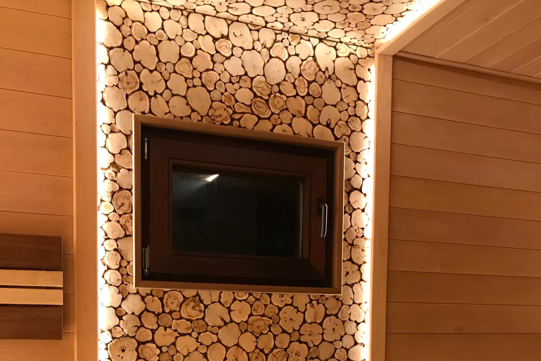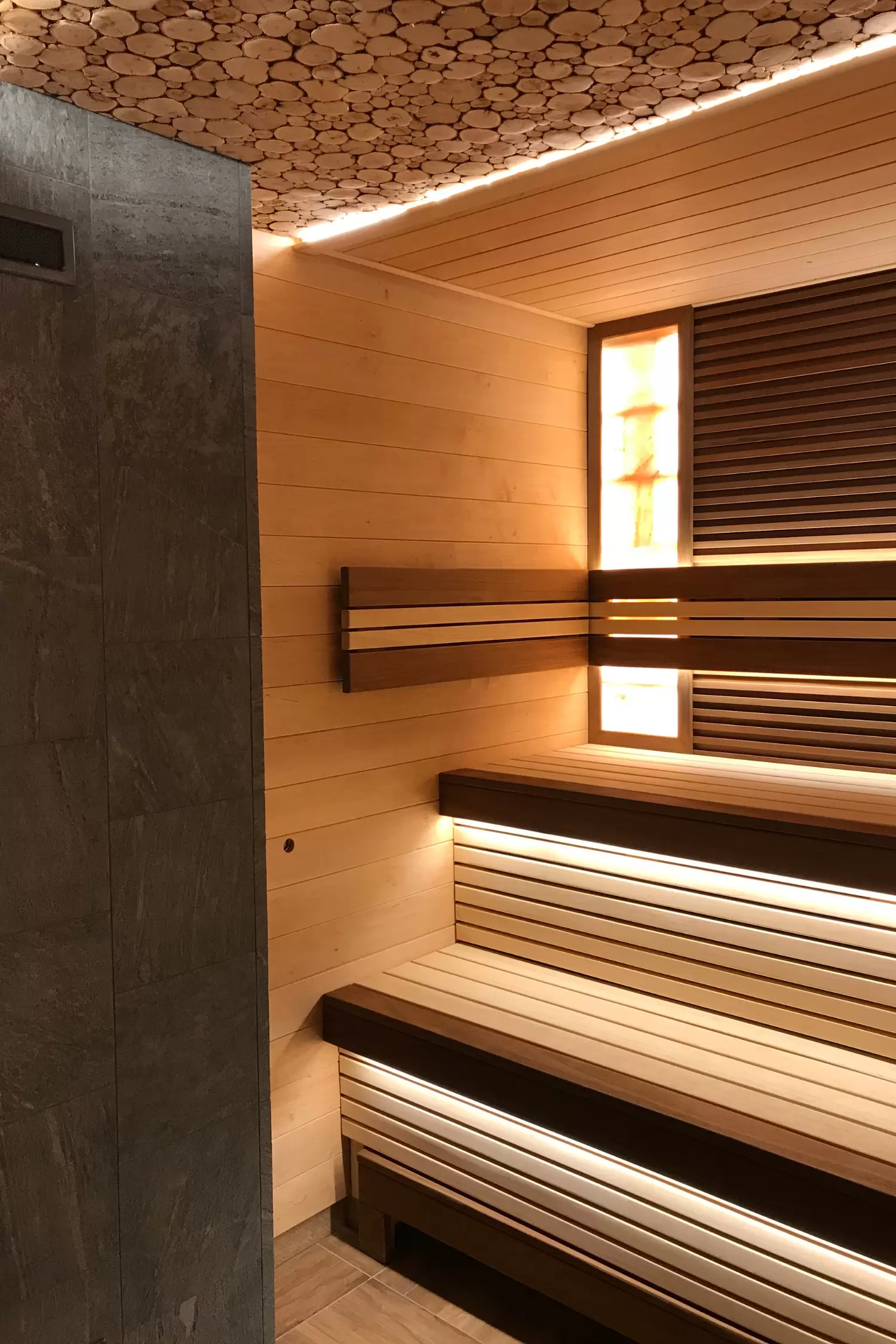 Очень интересный в исполнении и длительный проект. Сочетает в себе такие функциональные и эстетические решения как мобильный полок для парения с притоком воздуха, светильники из гималайской соли, панно из можжевельника, светодиодную подсветку полоков, декоративную стену из реечного абаша. Работы по данной парной велись на протяжении практически трех месяцев, что позволило довести данный проект до идеального состояния.